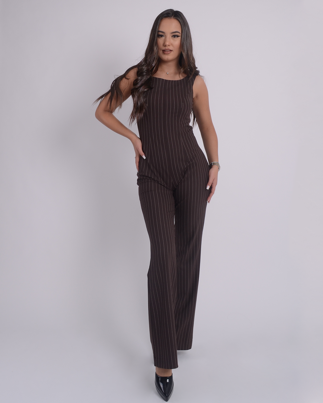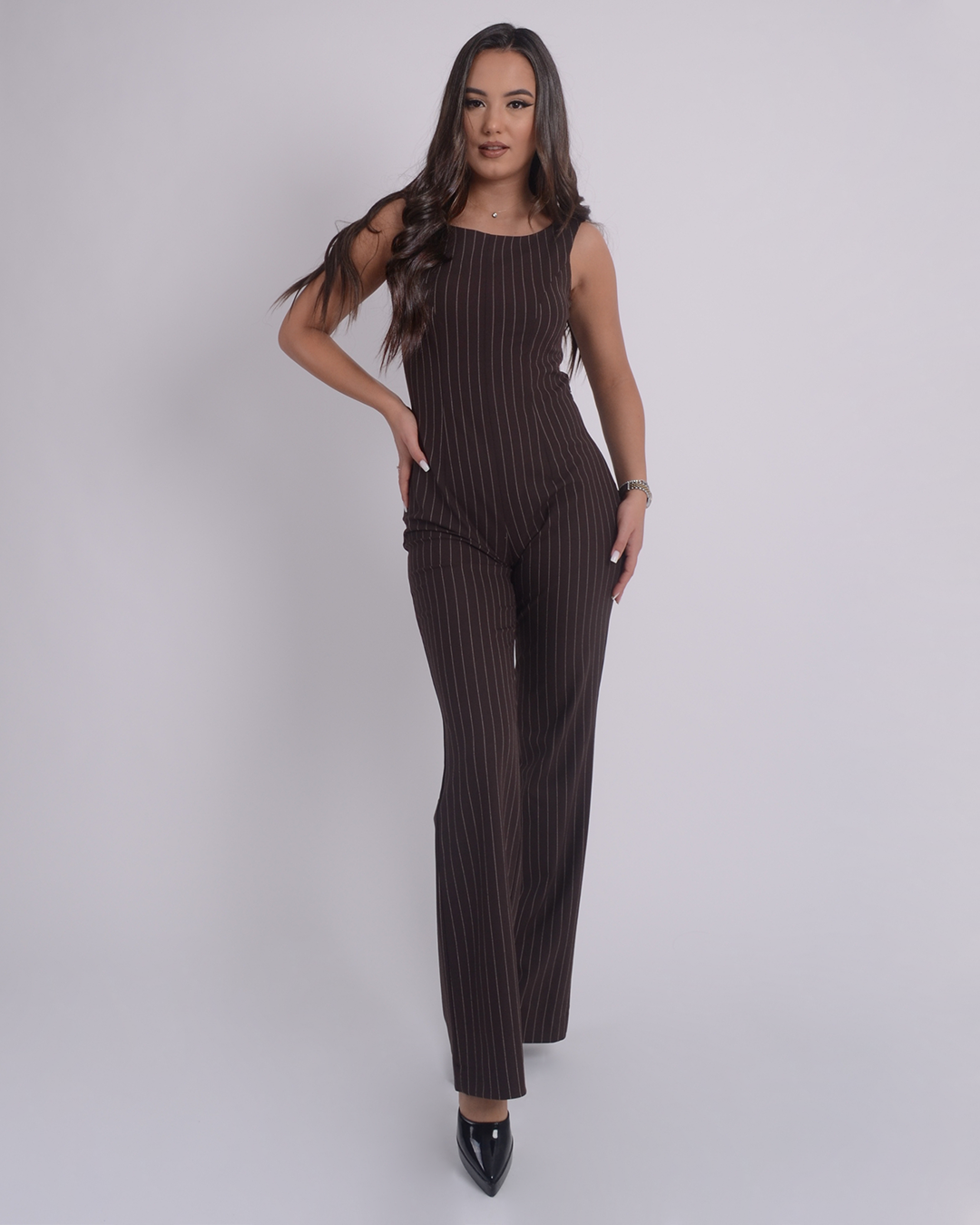 Гащеризонът впечатлява с изчистена линия и модерно кафяво райе, което носи едновременно елегантност и характер. Кройката е направена така, че да подчертае вертикалната линия и да създаде издължена, стройна визия. Материята е удобна, лека и еластична , подходяща за целодневно носене.